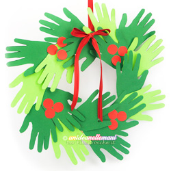 Ecco una bella ghirlanda natalizia da fare insieme ai bambini. Un lavoretto molto semplice da fare in famiglia o anche a scuola insieme alla maestra e che prevede un’attività che di solito diverte molto i bambini: disegnarsi le mani. Infatti questa ghirlanda è composta da tante sagome di piccole manine ritagliate su cartoncini di colore verde e poi incollate su una base di cartone rigido.