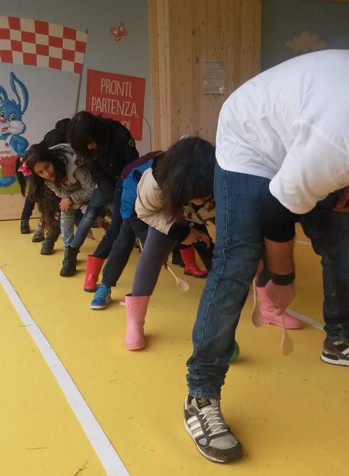 La caccia alle uova, infatti, si è fatta lo stesso. In uno scenario mozzafiato, con le maestose rovine imperiali sullo sfondo, era stato allestito il prato del coniglio, con balle di fieno, siepi e tende colorate. Dato il tempo, le molte attività avvenivano al riparo di stand coperti, ma questo non ha tolto nulla all’entusiasmo degli animatori e alla ricchezza dell’organizzazione. I bambini hanno giocato, disegnato, dipinto e infine si sono potuti cimentare nella caccia vera e propria. A gruppetti si sono lanciati nell’area dove erano stati nascosti i vari prodotti Kinder e, una volta raccolte cinque dolcezze diverse, hanno raggiunto di corsa la casa del coniglio Pasquale. Lì, dopo un ultimo gioco, hanno ritirato dalle mani pelose del coniglio il premio finale: l’uovo Kinder Gran Sorpresa oppure Pasquale stesso in cioccolato Kinder, ripieno dell’inconfondibile sorpresa.