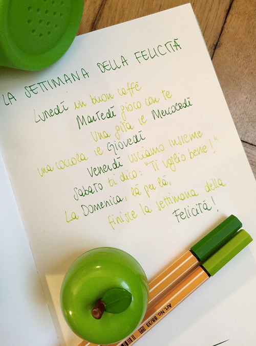 Vi invito a seguire il mio esempio, ritagliandovi pochi minuti di raccoglimento quotidiano per svuotare la mente dallo stress e mettere nero su bianco gli attimi felici della vostra vita. Come per magia, dopo pochi giorni di questa buona pratica vi accorgerete di vedere il bicchiere della vita sempre più mezzo pieno! #mygreenbook