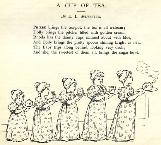 Phoebe brings the tea-pot, the tea is all a-steam;