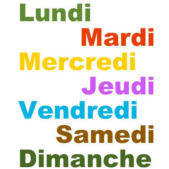 “Bonjour Lundi, Comment va Mardi?”. “Très bien, Mercredi”. “Je viens de la part de Jeudi Dire à Vendredi qu’il se prépare Samedi Pour le voyage de Dimanche”.