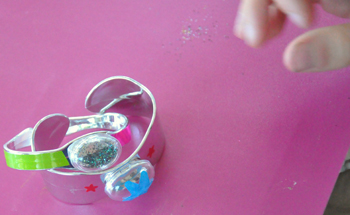 Sul braccialetto rigido argentato, potete applicare gli adesivi inclusi nel kit e le gemme che avrete creato con l’apposito gel (ricordate di preparare queste ultime con un giorno di anticipo perché siano asciutte in tempo).