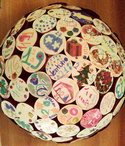 Il calendario è stato fatto con dei bicchieri di carta rossi pinzati tra loro fino a formare in modo naturale una mezza sfera, poi ogni bicchiere è stato riempito di dolciumi e chiuso con un cartoncino decorato.