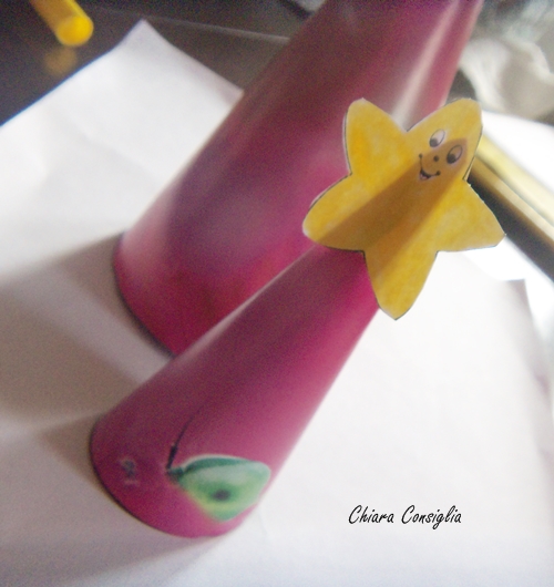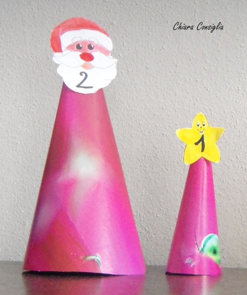 Ricordatevi di scrivere i numeri o sulla barba o sulla stellina! Le caramelle, o i cioccolatini oppure i messaggi andranno posizionati sotto al cono.
