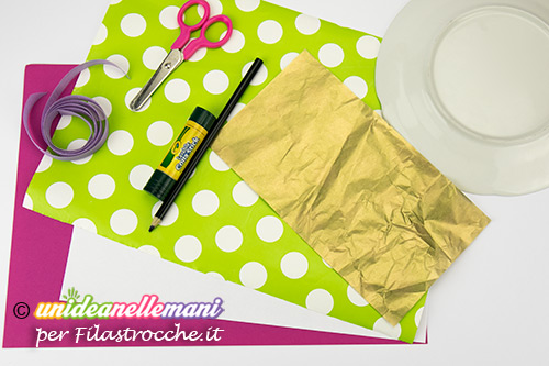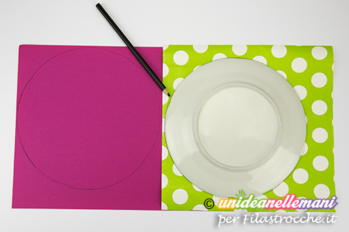 Posiziona il piatto sopra i fogli di cartoncino colorato e in fantasia. Se non hai del cartoncino in fantasia puoi crearlo come ho fatto io incollando della carta da regalo su di un comune cartoncino bianco.