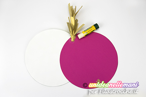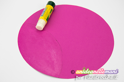 Sovrapponi i due cerchi ottenuti a circa 1/3 del diametro e incollali l’uno con l’altro a formare un “8” con un po’ di colla stick .