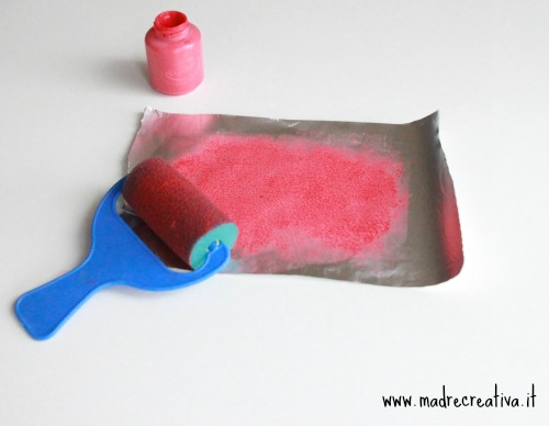 Versare la tempera lavabile Crayola di colore rosso sull’alluminio.
