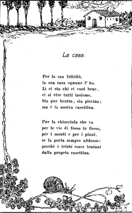 Testo tratto dal volume: "Sentimento e pensiero" di Francesco Bonatto e Ostilio Lucarini, libro di lettura per gli alunni e le alunne della seconda classe elementare (R. Bemporad & Figlio, 1916). Illustrazioni di Antonio Maria Nardi