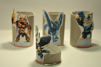 Tagliate le immagini dei personaggi Skylander che trovate nel PDF che potete scaricare cluccando qui e incollatele sui tubi di cartone. Tagliate l’eccesso di tubo lasciando una parte in fondo per poterlo appoggiare sulla base.