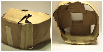 Unite il disco al bordo incollando le linguette al disco stesso con la colla stick e fermandole dall’interno del cilindro con il nastro carta. Una parte del cerchio superiore sborderà: piegatela sul bordo e fissate il tutto con tre giri di nastro carta.