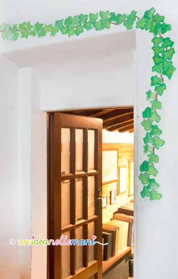 Mia figlia qualche tempo fa, volendo decorare la stanza dove studia, ha pensato di fare una decorazione usando le foglie come stencil creando così un motivo floreale in un punto della stanza che a lei piaceva particolarmente abbellire.