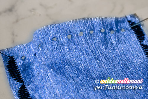 Adesso infila un ago con un filo di lana colorato o in una tinta che ti piace e passalo tra i fori in modo da chiudere bene la calza.