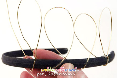 Partendo da un lato del cerchietto, forma delle grosse asole con il filo di metallo, avvolgendo il filo e fissandolo con la colla sul cerchietto.
