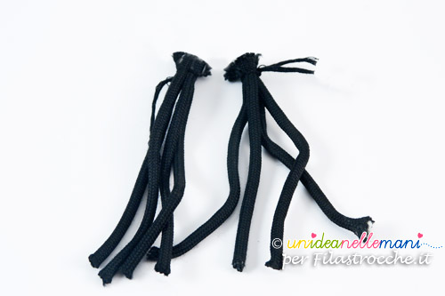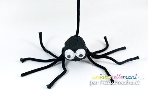 Incollare poi anche un filo di sostegno sopra al ragno (può essere un laccio da scarpe oppure un filo di lana nero).