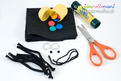 Metti le caramelle dentro al porta sorpresine, chiudilo e incartalo con la carta crespa nera come fosse un uovo di Pasqua.