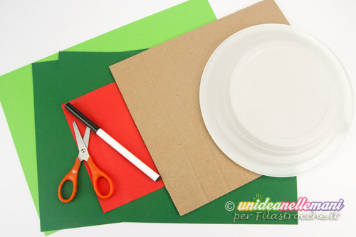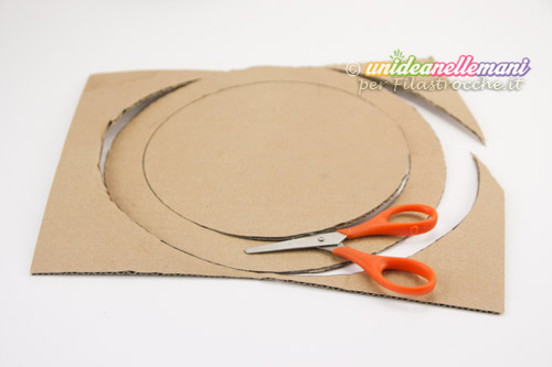 Disegna sul cartone due cerchi circoncentrici ricavandone una corona. Io mi sono aiutata con due piatti, uno più piccolo dell’altro.