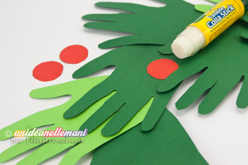 Una volta attaccate tutte le mani, taglia sul cartoncino rosso dodici piccoli cerchi del diametro di due centimetri ed incollali sulla ghirlanda a grippi di tre in modo da simulare bacche di pungitopo.