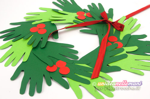 Ecco una bella ghirlanda natalizia da fare insieme ai bambini. Un lavoretto molto semplice da fare in famiglia o anche a scuola insieme alla maestra e che prevede un’attività che di solito diverte molto i bambini: disegnarsi le mani.