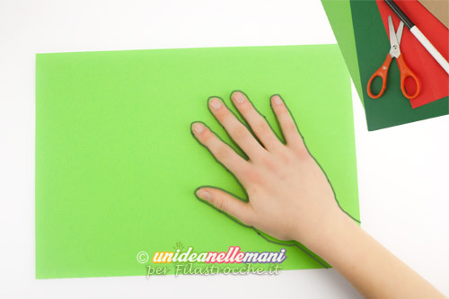 Per cominciare fai appoggiare la manina del bambino sopra al cartoncino colorato e con l’aiuto di un pennarello disegnane la sagoma facendo scorrere la punta lungo tutto intorno.