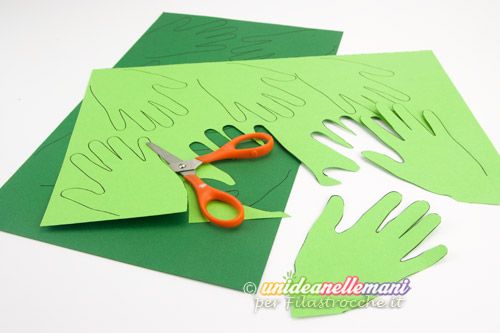 Infatti questa ghirlanda è composta da tante sagome di piccole manine ritagliate su cartoncini di colore verde e poi incollate su una base di cartone rigido.