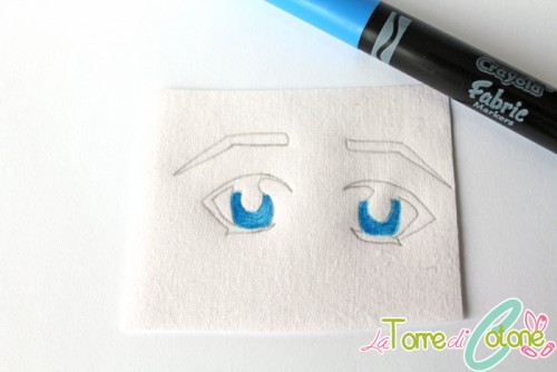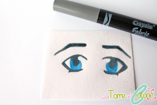 Ora prendete i pennarelli per tessuti del colore che preferite e iniziate a colorare l’iride e poi i vari dettagli più scuri.