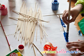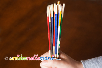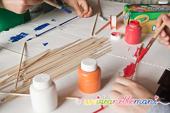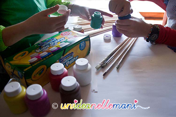A questo punto, dopo aver steso un po’ di carta per proteggere il tavolo, i bambini possono colorare liberamente i bastoncini con i pennelli e le tempere.