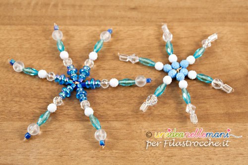 Adesso divertiti a creare tanti fiocchi di neve con le perline anche usando forme e di colori diversi. Potrai appendere le tue decorazioni all’albero di Natale o alle finestre o dove ti piace di più.
