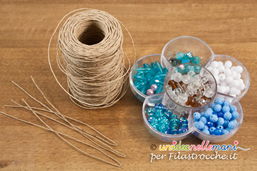 Infila una ad una le perline che hai scelto in ognuno dei raggi del tuo fiocco di neve.