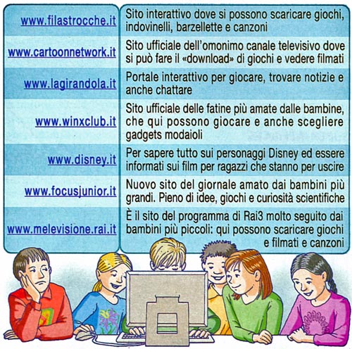 Nella tabella qui sopra, gli indirizzi dei sette siti più “cliccati” da bambini e ragazzi. E, visti i contenuti, sono anche i sette più adatti alla loro età.