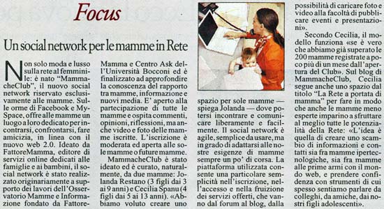 Non solo moda e lusso sulla rete al femminile: è nato “MammacheClub“, il nuovo social network riservato esclusivamente alle mamme. Sulle orme di Facebook e MySpace, offre alle mamme un luogo a loro dedicato per incontrarsi, confrontarsi, fare amicizia, in linea con il nuovo web 2.0. Ideato da FattoreMamma, editore di servizi online dedicati alle famiglie e ai bambini, il social network è stato realizzato originariamente a supporto dei lavori dell’Osservatorio Mamme e Informazione fondato da FattoreMamma e Centro Ask dell’Università Bocconi ed è finalizzato ad approfondire la conoscenza del rapporto tra mamme, informazione e nuovi media. E’ aperto alla partecipazione di tutte le mamme e ospita commenti, opinioni, riflessioni, ma anche video e foto delle mamme iscritte. L’iscrizione è moderata ed aperta alle sole mamme o future mamme.
