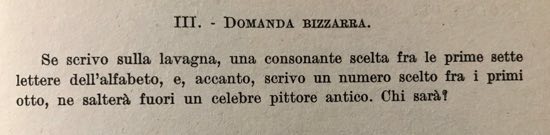 Se scrivo sulla lavagna una consonante scelta tra le prima sette lettere dell’Alfabeto, e, accanto, scrivo un numero scelto tra i primi otto, ne salterà fuori il nome di un celebre pittore antico.