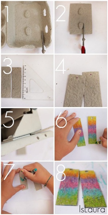Devo dire che il cartone di cui sono fatti gli imballaggi delle uova mi piace alquanto, nel senso che mi piace quando viene dipinto, colorato e disegnato, la resa è a dir poco entusiasmante, con la sua superficie irregolare e la giusta porosità, il colore permea in maniera adeguata senza scivolare. Ho lavorato scatole diverse, sia la parte interna, quella che deve mantenere le uova nella giusta posizione, per intenderci quella “anatomica”, ho usato la parte superiore che mi ha fatto venire in mente degli strani visi per creare dei teschi e oggi l’avventura è più semplice, utilizzando la parte superiore, quella del coperchio, per farne degli orecchini colorati.
