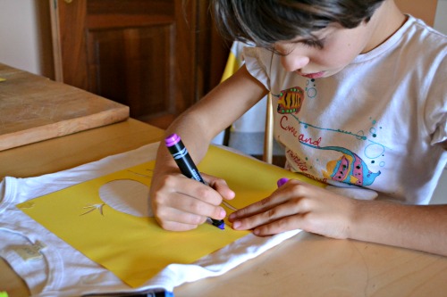 Appoggiate il cartoncino sul tagliere e ritagliate lungo i contorni del disegno con il taglierino. Fissate ora il cartoncino sulla maglietta con un po’ di nastro adesivo.