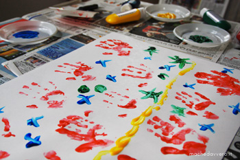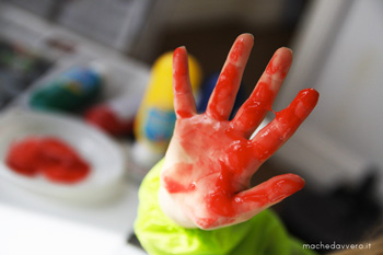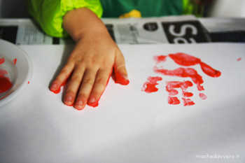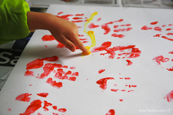 Vi consiglio di iniziare con le impronte della manina, facili e divertenti, che possono creare un pattern di base per il disegno.