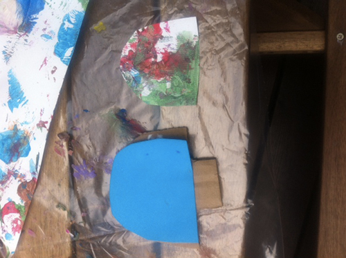 Con un foglio di cartoncino colorato creare delle forme da incollare per ricoprire le ali. E con un foglio di carta bianca colorata e decorata a piacere ritagliare dei bolli da incollare alle ali. Qui mentre io mi occupavo di fare 4 tagli nella bottiglietta di plastica per inserire le ali e due buchini per le antennine, i piccoli artisti ne hanno approfittato per cimentarsi in una parentesi di action painting: pittura con le mani, rullo, schizzi e lazzi.