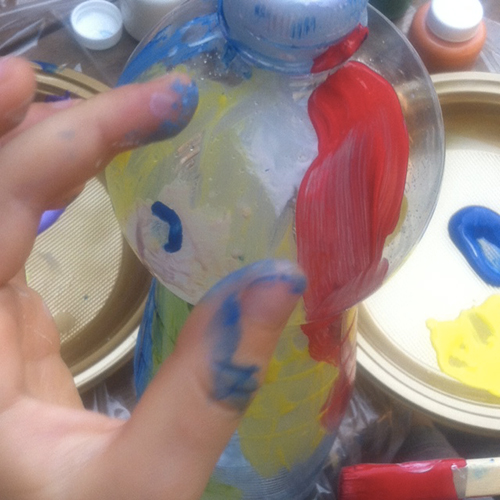 Colorare la bottiglietta-corpo della farfalla. Io ho volutamente lasciato libera mia figlia quattrenne di scegliere e mixare le tempere come più desiderava, senza intervenire con dritte o divieti di sorta.