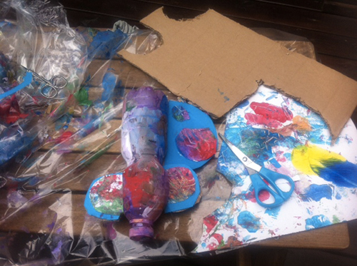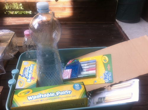 L’idea della farfalla colorata da appendere, fatta riciclando le bottigliette dell’acqua, è liberamente ispirata a un’installazione artistica che ho visto recentemente (lì erano aerei però!), ma l’interpretazione è frutto di un lavoro a 6 mani, che potevano allegramente attingere da un pacco di materiali ricevuti in dono da Crayola per colorare/dipingere/creare.