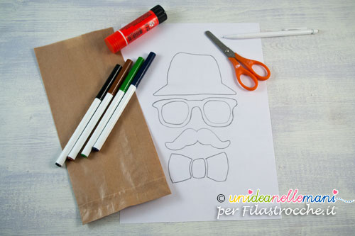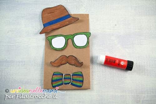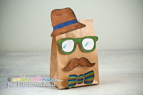 Il lavoretto consiste nel creare un pacchettino con le sembianze di papà. Il bello è che nel muovere il pacchetto, cappello, occhiali, baffi e papillon dondoleranno simpaticamente.