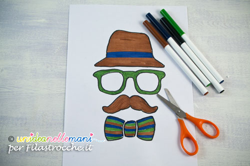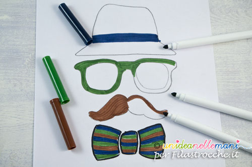 Su un foglio di carta disegna, o fai disegnare al tuo bambino, la sagoma di un cappello da uomo, un bel paio di occhiali, dei simpatici baffi, un grosso papillon.