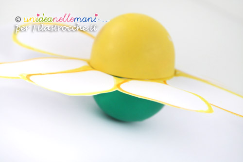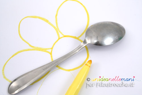 A questo punto prepara su di un foglio di carta una margherita aiutandoti, per fare i petali, con un cucchiaio da minestra.