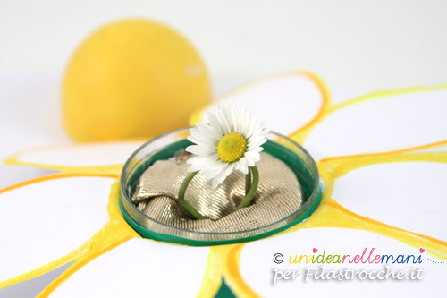 Ecco allora che ti propongo di fare questo originale fiore di carta, che -detto tra di noi- non è un semplice fiore di carta (in questo caso una margherita) e non è neanche tutto di carta, ma magia…magia…si trasformerà in un cofanetto con sorpresa da regalare alla mamma.