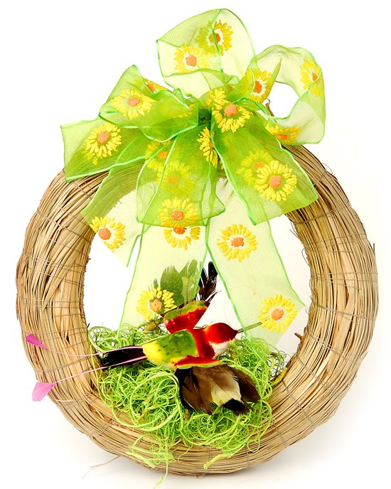 Ricoprire la ghirlanda di vimini con in nastri e fermarli con un fiocco, alla cui base incollerete i pulcini.