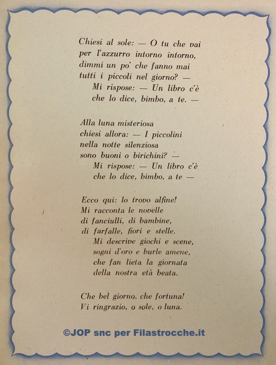 Questa poesia era pubblicata all’inizio del volume dal titolo “Il Giorno dei Piccoli” (Paravia – 1944), una raccolta di storielle, poesie e filastrocche di Arpalice Cuman Pertile e che raccontavano la giornata dei più piccoli.