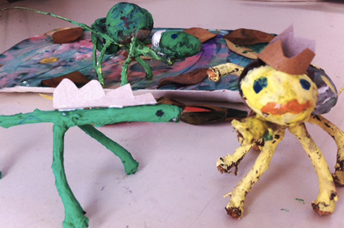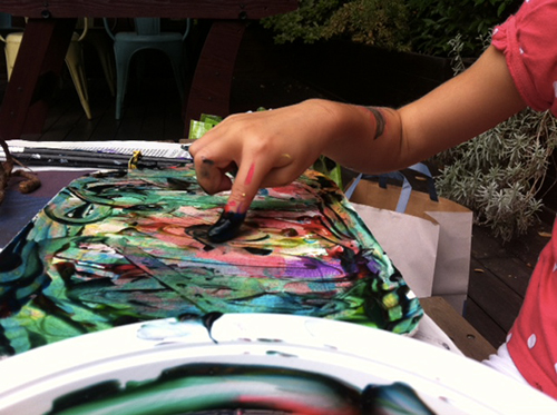 Visto che Elettra, dopo aver dipinto le sue coccinelle, ha addocchiato i colori a dita e non vedeva l’ora di dar sfogo alla sua cratività, le ho affidato il vassoietto- habitat (che useremo poi per riporre gli animali finiti) con il compito di “personalizzarlo”.