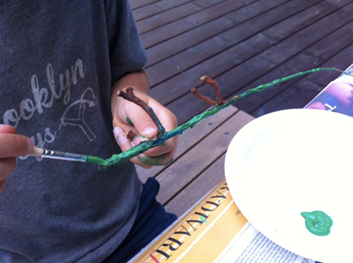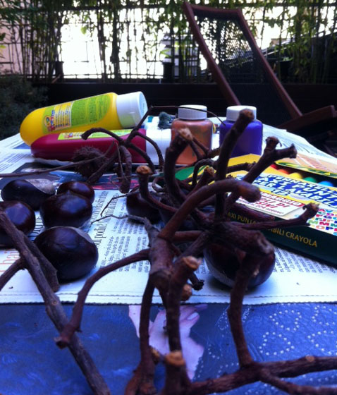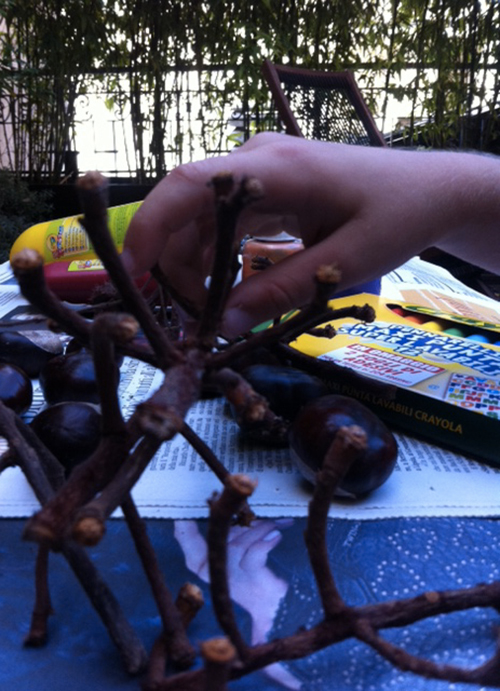 Una volta finito di dipingere le castagne e i legnetti e dopo averli fatti asciugare bene, comincia la parte più difficile e che richiede più pazienza. Vi lascio indovinare a chi è toccata… Con la colla bisogna attaccare tutti i pezzi fino a raggiungere la forma che abbiamo in mente.