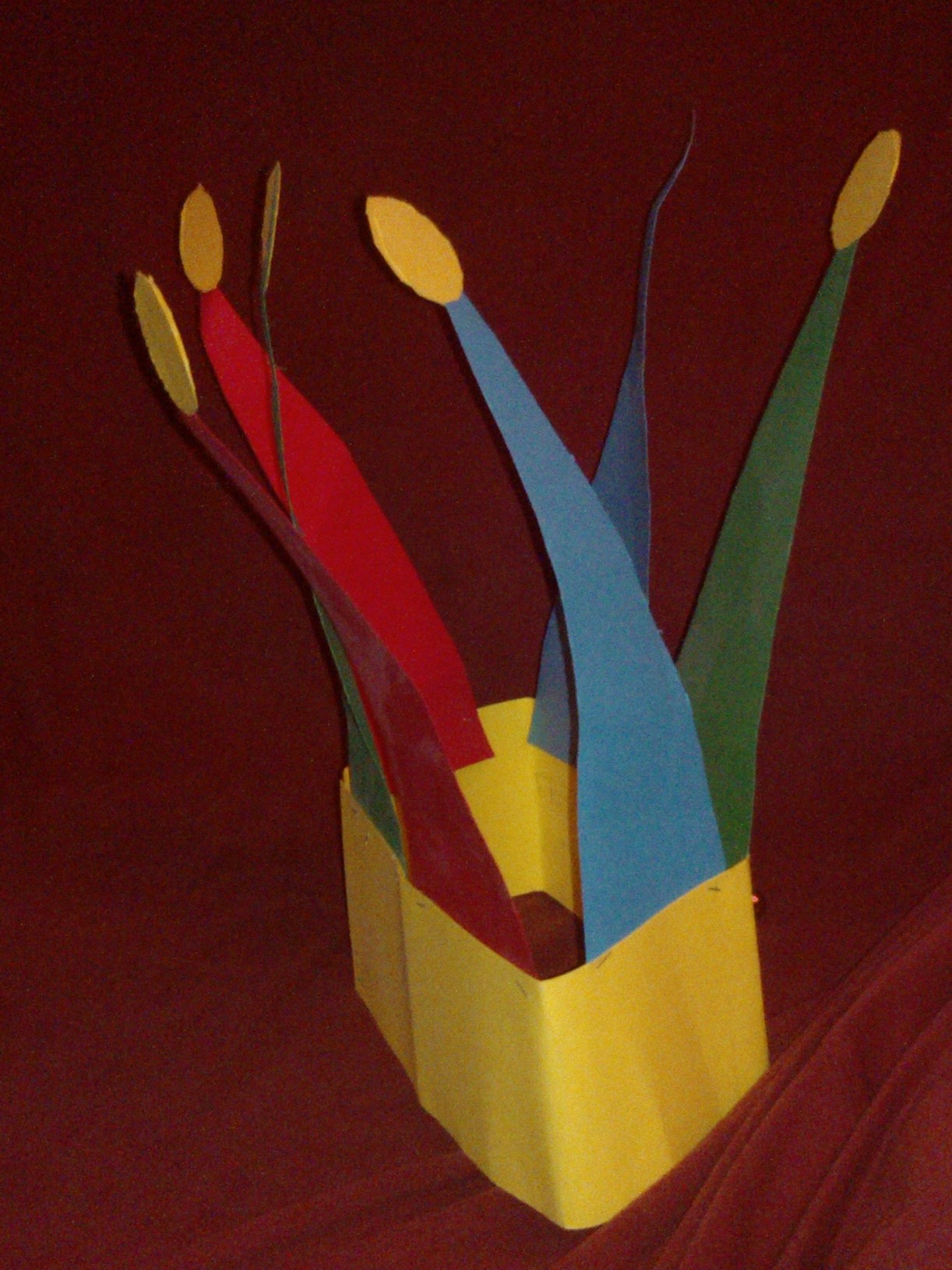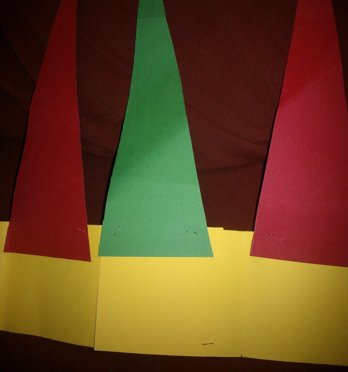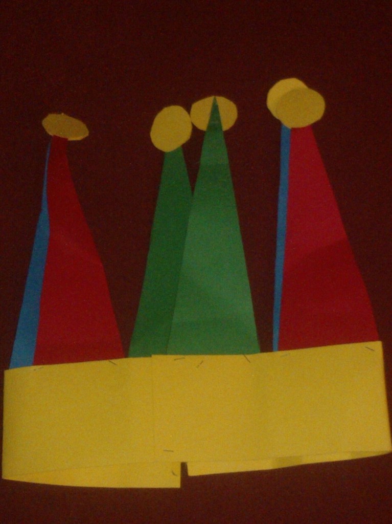Come si vede in foto, ritagliate sei triangoli isoscele da cartoncini di colore diverso (anche in questo caso si possono prima disegnare le sagome oppure ritagliare direttamente), con la base di circa 6-7 cm e i due lati uguali di circa 15-20 al massimo, poi piznateli alla striscia di cartone, sempre in base alla dimensione della testa del bambino.