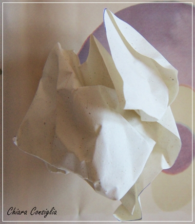 Accartocciate un foglio di carta. Io ne ho usato uno di carta riciclata, per questo non è bianco candido. Più è stropicciato, più è adatto al lavoro.