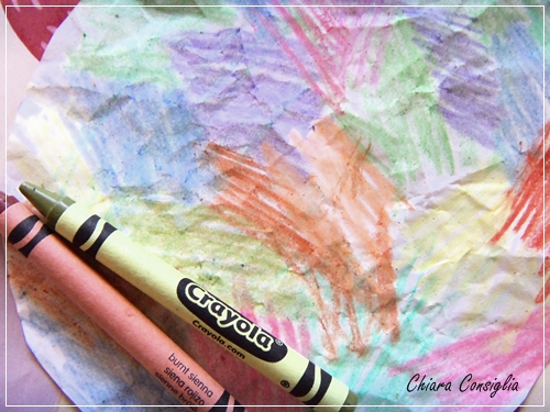 Poi coloratelo casualmente con i pastelli a cera, giocando con le tonalità. I bambini in questo sono dei fenomeni!