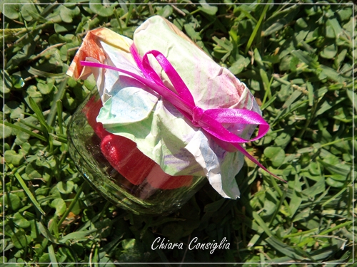 Riempite il vasetto di caramelle, posizionate il vostro cerchio colorato e richiudetelo con un nastrino di raso o di carta…..et voilà!