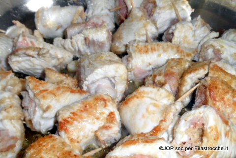 Rosolate bene la carne, girandola più volte e facendo attenzione a non farla attaccare. Bagnate con il vino bianco, fatelo evaporare, abbassate la fiamma e continuate la cottura per circa 15 minuti, girando gli involtini di tanto in tanto per una cottura uniforme.